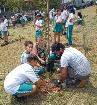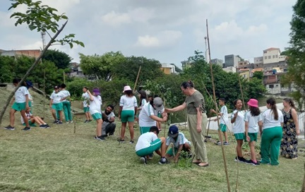 Equipe do Projeto Mini Pomares Urbanos realiza, ao longo desta quarta-feira (18/3), ação educativa com alunos da EMEIEF Professora Etiene Sales Campelo, no Jardim Santo Antônio. Em pauta, alimentação saudável e combate à poluição. Educadores ambientais também explicaram a importância de um mini pomar na segurança hídrica e sustentabilidade local, pois árvores aumentam a absorção de águas da chuva, reduzindo o calor, melhorando o solo e diminuindo riscos de falta de água nas comunidades. Depois, os estudantes plantaram 65 árvores frutíferas da Mata Atlântica em área anexa a unidade escolar.