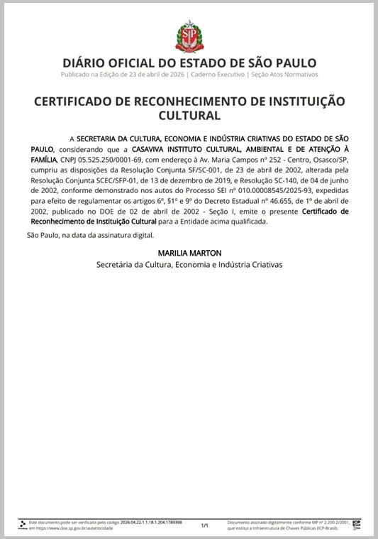 O Governo do Estado de São Paulo, por meio da Secretaria da Cultura, Economia e Indústria Criativas, emitiu, no dia 22 de abril, o Certificado de Reconhecimento de Instituição Cultural (CRIC) para a Casaviva Instituto. O documento atesta a relevância das atividades desenvolvidas pela Casaviva e consolida seu papel estratégico na promoção e difusão das expressões artísticas e da economia criativa em território paulista.