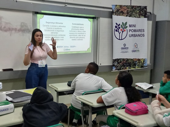 Por meio do Projeto Mini Pomares Urbanos, da Casaviva Instituto, alunos, professores e direção participaram de uma roda de conversa inspiradora sobre segurança alimentar e arborização seguida pelo plantio de 60 árvores frutíferas da Mata Atlântica. A ação focou na ressignificação da área escolar visando a melhoria da convivência, o lazer, a contemplação e promoção da educação ambiental.